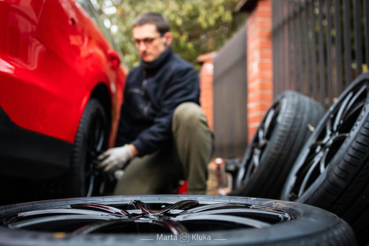 W każdym razie dziś moja czerwona strzała została w końcu, rękoma wspomnianego męża, scalona ze swoimi nowymi czarnymi kółkami, czekającymi na nią już z 4 miesiące… Bosz, jak to pięknie wygląda 🙂